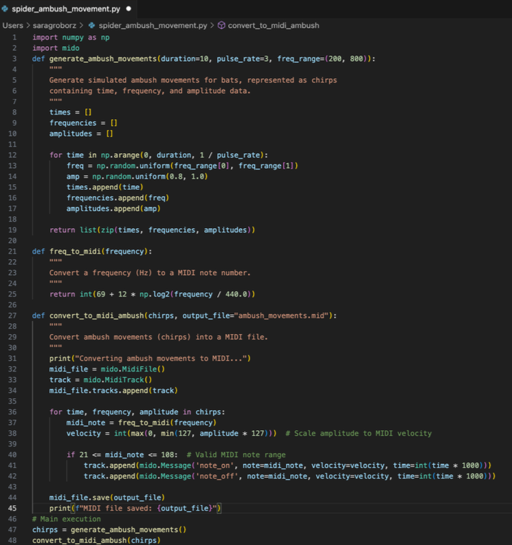The performance uses L-systems to simulate growth and branching behaviours, weaving together visuals and sounds that reflect nocturnal life forms navigating their environments. From bat-like echolocation pulses to spider web resonance, from moth-like erratic fluttering to luciferase-inspired light flickers — the experience unfolds as a living code chamber: rhythmic, reactive, alive.